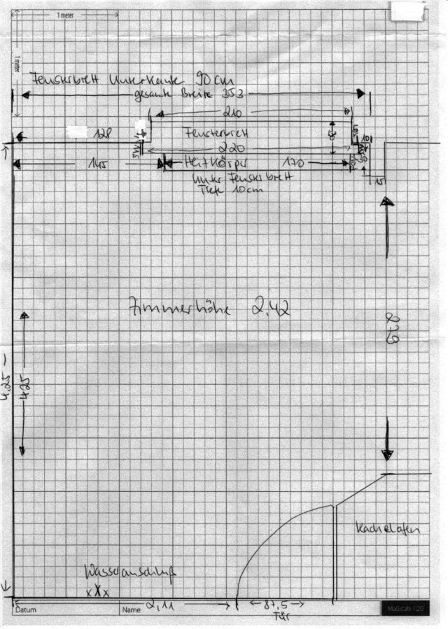 Wie lang und wie tief ist der Heizkörper? das Fensterbrett steht 10cm vor? Känntest du diese Maße in der Skizze ergänzen?