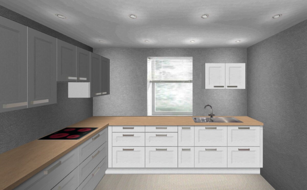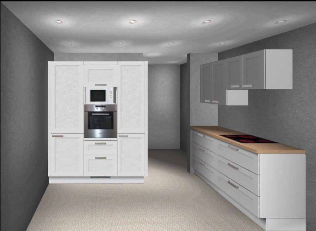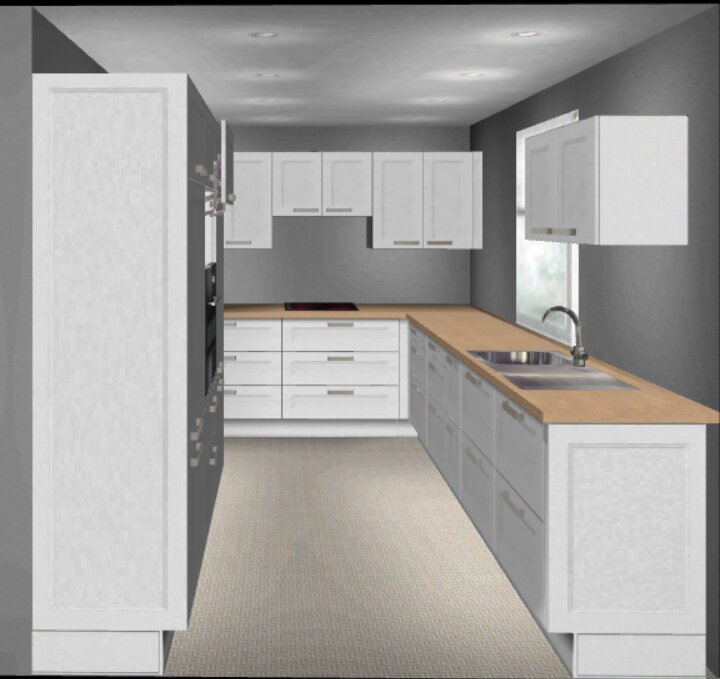 Ideal sind Küchen, die keine Ecken haben. In deiner Küche hätten wir 2 Zeilen geplant, wenn die tür an der kurzen Wand gewesen wäre.