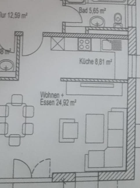 ich und mein Partner ziehen im Mai in eine Neubauwohnung. Im Wohn-/Essbereich ist die Küche vorgesehen. Die Anschlüsse werden wie im Grundriss gelegt. Allerdings kommt die schraffiert eingezeichnete Wand nicht (siehe Grundriss) - bitte diese ignorieren.