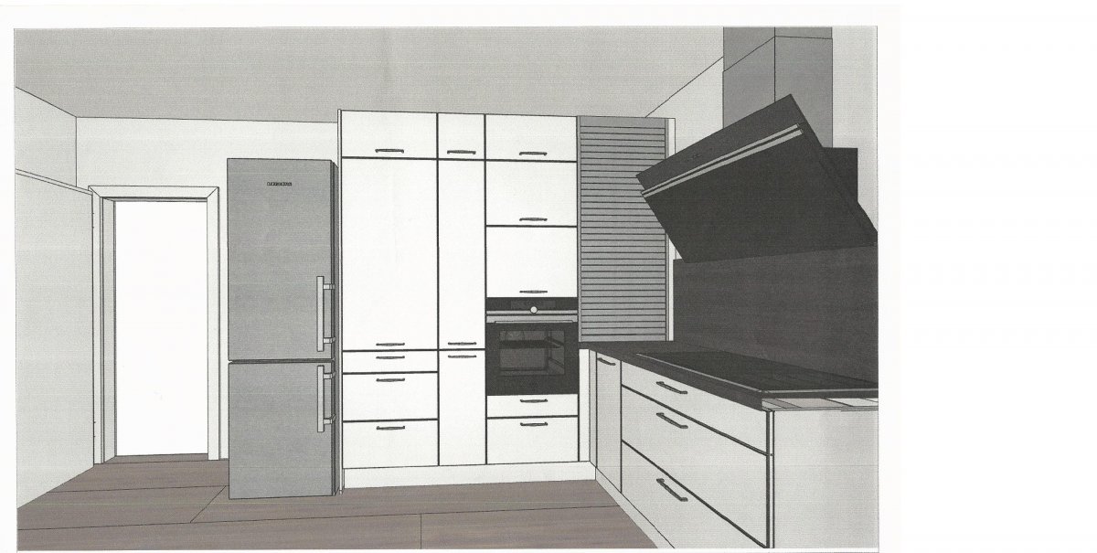 Ein Standkühlschrank ist vorhanden (60*200), dieser soll bleiben, kann aber evtl. auch integriert (umbaut) werden
