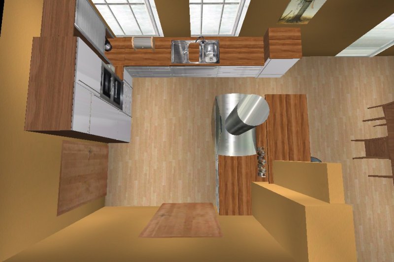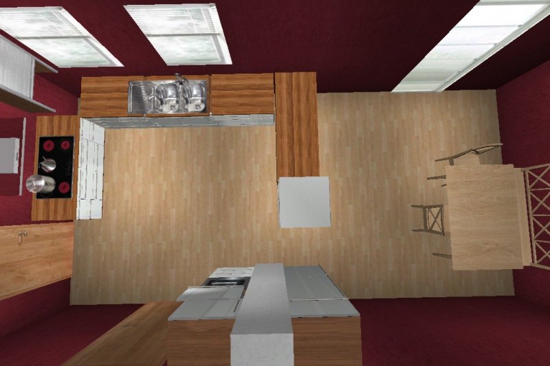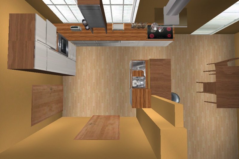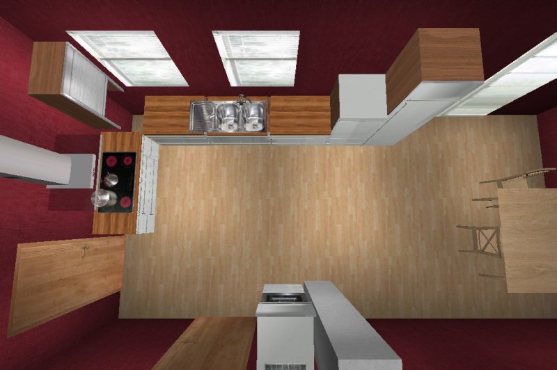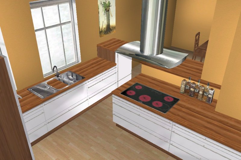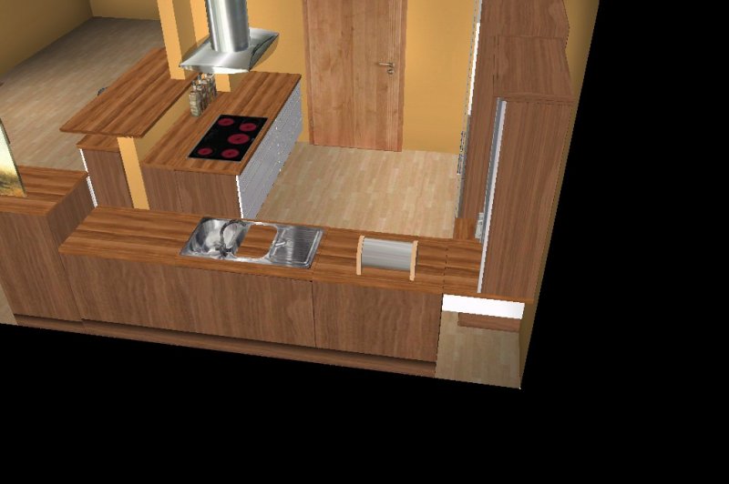 Zu Anfang hatte ich die Spüle anstelle des Kochfeldes, den Geschirrspüler in der Ecke vorm Kamin. Dann war kein Platz mehr zum Schneiden, Vorbereiten, etc., außerdem soll im Spülenunterschrank ein großer Auszug für den Abfall, Spülmittel, Putzlappen, usw. untergebracht werden. Ich hätte also alle Schnippelabfälle durch die Küche dorthin tragen müssen. Bild und Grundriss aus Plan 3.