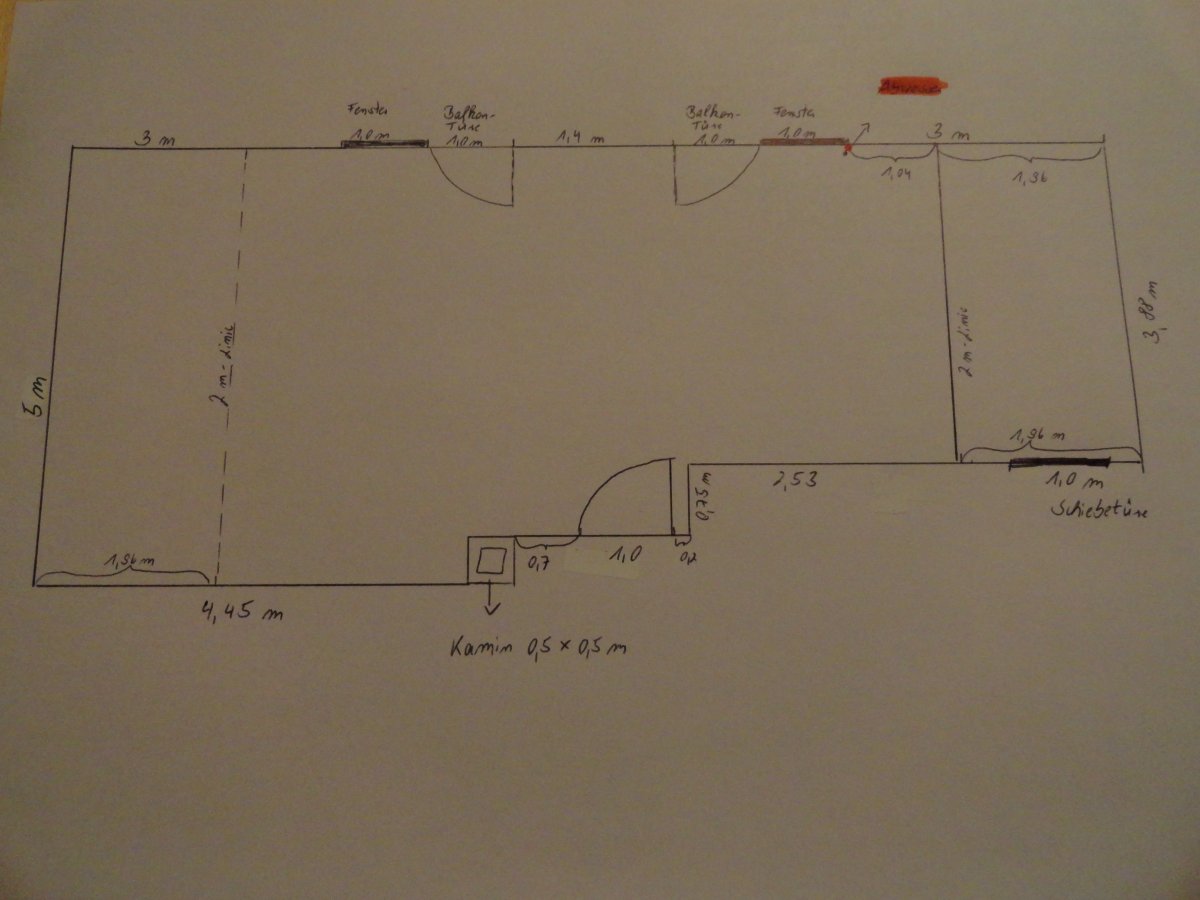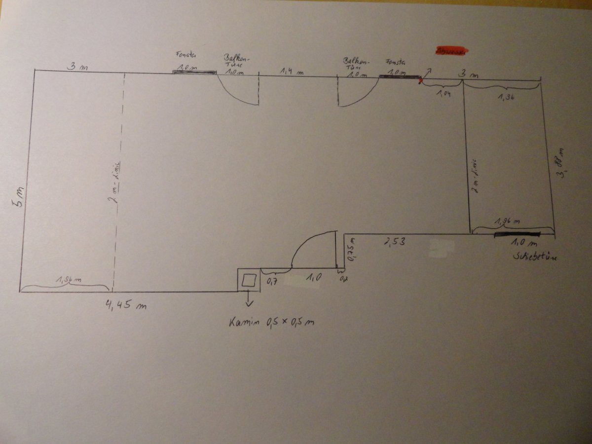 Heizkörper müssen ebenfalls im Raum berücksichtigt werden (Fußbodenheizung nicht möglich). Im Bereich des Kamins (Planunten Mitte) ist ein Kaminofen geplant.