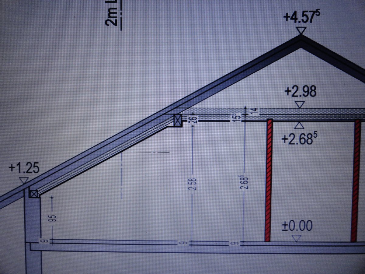 Die Kniestockhöhe beträgt 1,0 m. Die Dachneigung ist ca. 26 Grad. Die 2-M-Linie wird Planlinks nach ca. 1,96 m erreicht. Die geplante Raumhöhe ist ca. 2,5 m.