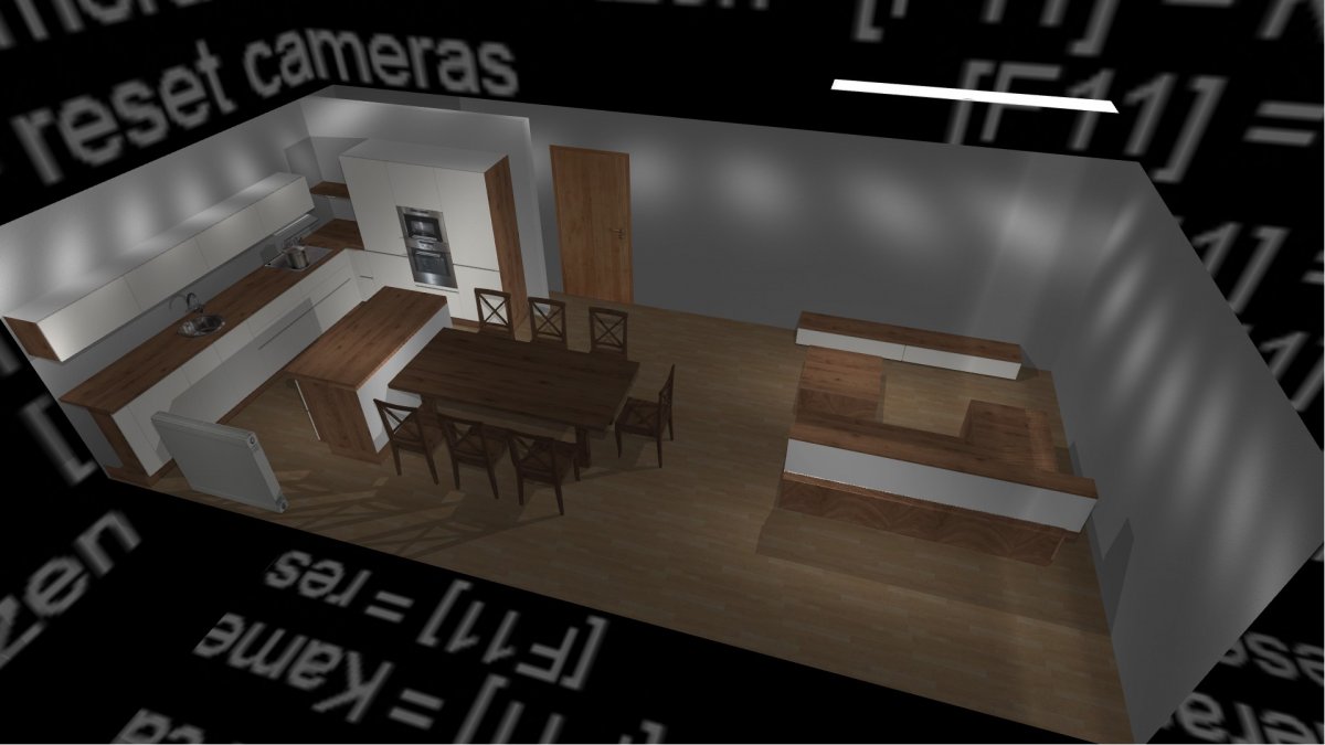 Es handelt sich um einen aktuell offenen Wohn-Essbereich mit Küche. Der Raum Planrechts stellt aktuell eine Art "Speisekammer" dar und ist durch Trockenbau von der eigentlichen Küche getrennt.