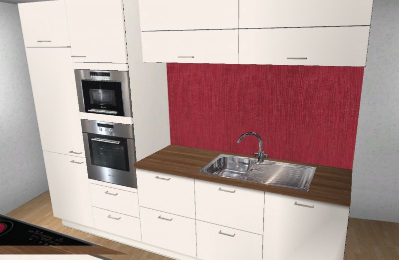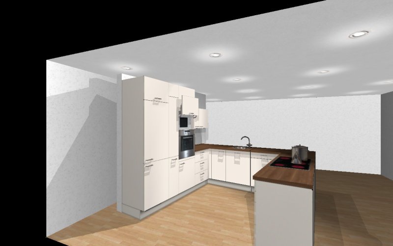 Ich war nun letzte Woche in einem kleinen Küchenstudio vor Ort und habe deren Entwurf angehängt. Allerdings gefällt er uns beiden leider gar nicht. Irgendwie ist die Küche zu "08/15", uns fehlt jegliche Raffinesse, denn sie darf gerne ein kleines Highlight in der Wohnung werden. Trotzdem habe ich den Entwurf nun mal im Alno -Planer ungefähr nachgebaut, damit man eine Grundlage hat. Wir sind aber sehr sehr offen für Änderungen, auch größere! Um Details wie Farbe, Griffe, Arbeitsplattenmaterial- und höhe soll es erstmal noch nicht gehen.