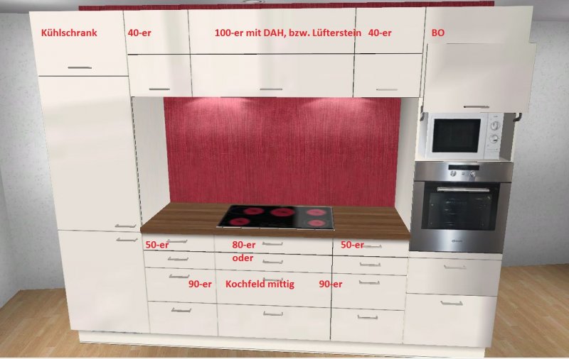 Zu den Geräten: Auf einer Messe haben wir das Bora Dunstabzugssystem gesehen, was uns sehr zusagt! Es gibt wohl auch Alternativen von Siemens und anderen Herstellern. Auf eine klassische Dunstabzugshaube mitten im Raum würden wir gerne verzichten. Einen Dampfgarer möchten wir auf jeden Fall, vielleicht auch als Kombigerät mit Backofen . Auf eine Mikrowelle wollen wir langfristig verzichten, vielleicht am Anfang noch als Stand-Alone-Gerät. Beim Herd denken wir an Induktion . Der Kühlschrank könnte auch als schönes Stand-Alone-Gerät ausgeführt werden. Außerdem spielen wir mit der Idee eine Siebträgerkaffeemaschine anzuschaffen. Dann wäre natürlich eine Schublade darunter bzw. MUPL sehr sinnvoll.