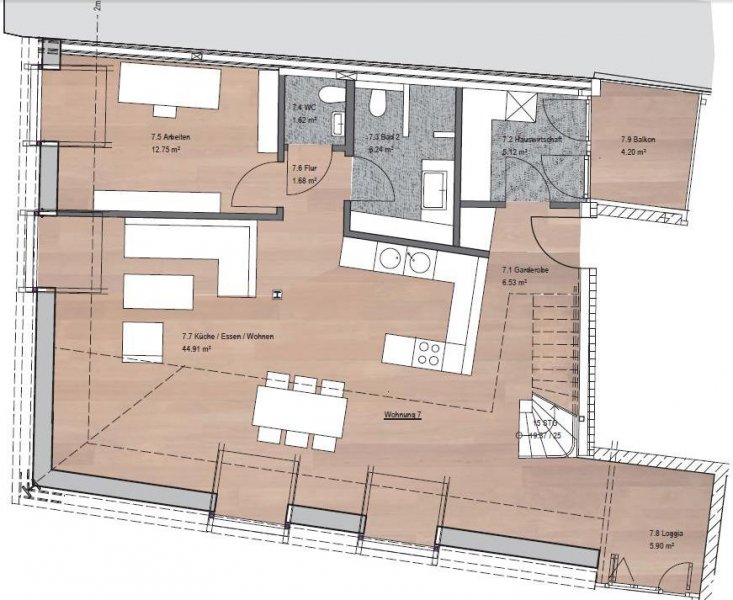 Man kommt auf der Südseite (im Plan rechts) aus dem Treppenhaus in die Wohnung und betritt auch gleich den großen Wohn- und Essbereich. Der Vorschlag einer U-förmigen Küche stammt vom Architekten und gefällt uns. Eine Insel fänden wir auch toll, haben aber Sorge dass man dann immer "durch die Küche in die Wohnung" gehen würde, was ich nicht so schön fände. Vielleicht kann man das aber auch mit Insel durch intelligentes planen vermeiden...?