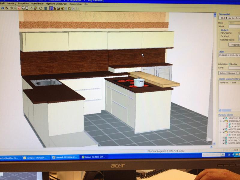 Kühlschrank soll ein neuer freistehender Kühlschrank her. Wir wollen ein 90er Kochfeld, Ceran oder Induktion ist noch nicht entschieden. Spülmaschine wird hochgebaut. Bei der Planung wird in den linken Hochschrank noch eine Dampfgarer und eine Wärmeschublade eingeplant, derzeit wahrscheinlich aus Kostengründen nur als Vorrichtung. Das Waschbecken ist von Blanco Silgranit in braun angedacht. Auch direkt in die Arbeitsplatte eingebaut ohne Rand.