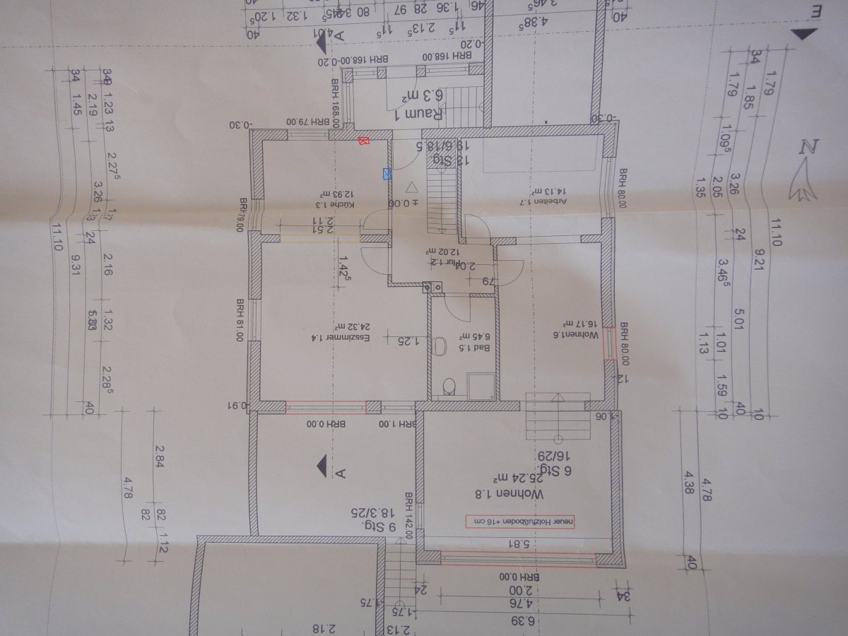 Die Lage von Stromanschluss (rot, veränderbar) und Zu/Abwasser (blau, nur gering veränderbar) habe ich im bemaßten Geschoss-Grundriss eingezeichnet. Den Pla habe ich gedreht, damit der Plan mit der Orientierung Alno-Planer übereinstimmt.