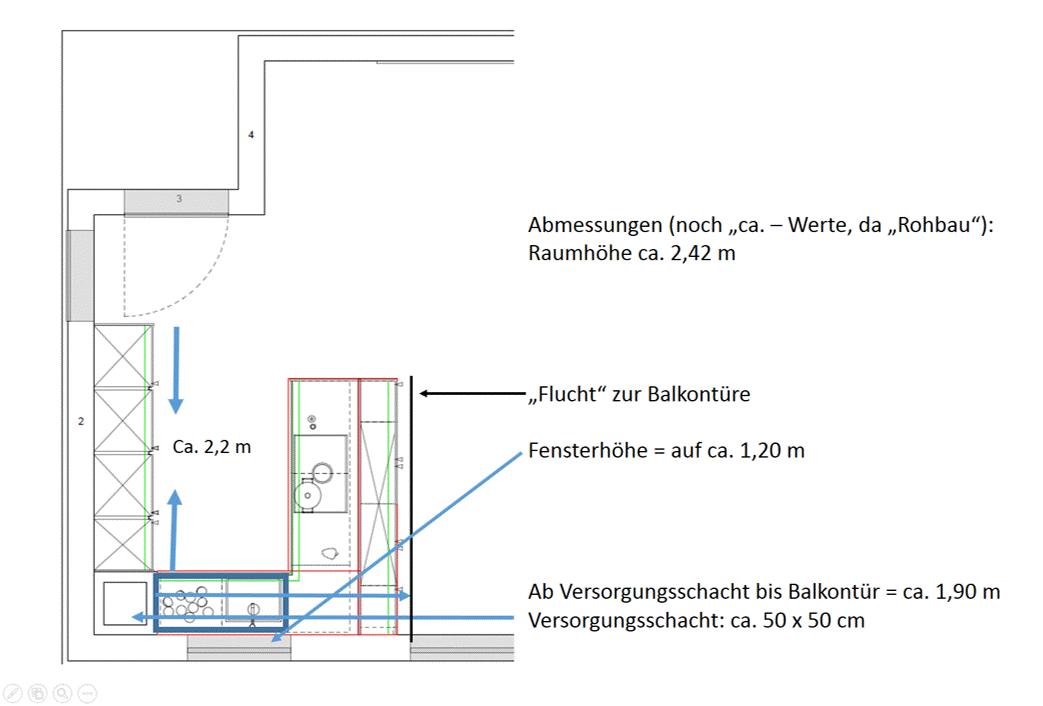 Alternativ könnte man übrigens an der Wand oben rechts neben der Tür 2 Hochschränke stellen und dahinter noch einen Mini-Abstellraum oder Vorratsbereich schaffen.