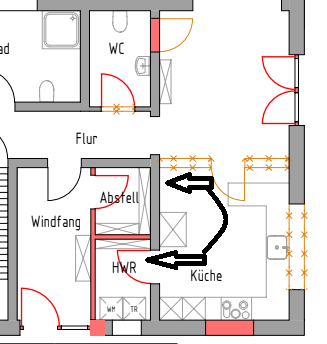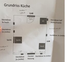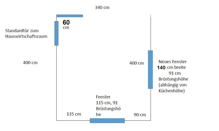 vielen Dank für die sehr schnellen und sehr guten Rückmeldungen! Ich habe Eure Hinweise nochmal in die Bilder aufgenommen (aktuelle Schrankbreiten und ein neuer Grundriss mit etwas größerer Auflösung; leider immer noch sehr einfach, da uns aktuelle Bauzeichnungen der Küche nicht vorliegen bzw. nicht 1:1 korrekt sind). Die Küche selbst ist 400x340 und der Zugang ist aktuell noch mit Standard-Innentür. Die Wand wird aber geöffnet (voraussichtlich wie im Bild mit einer Wand links von 60cm (in der Flucht zu den Hochschränken, auf der anderen Seite vollständig auf). Diesen 60cm-Wand benötigen wir ggf. für eine Hochheizung, da wir ggf. keine Fußbodenheizung integriert bekommen. Die restlichen Installationen sind alle noch variabel, auch die Fensterbreite (aktuell 140) ist noch nicht fix, wird aber von der Küche abhängig gemacht. Ich hoffe, die Maße reichen so aus, sonst versuche ich gerne, noch mehr anzugeben.