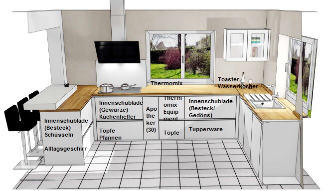 Den 30er Miniapotheker neben dem KF weg lassen und statt dessen den US mit Thermomix-Zubehör breiter machen.