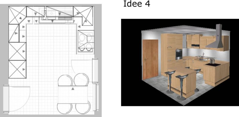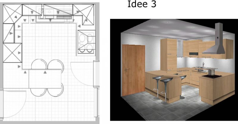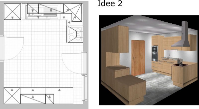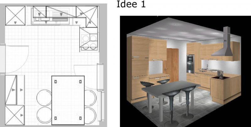 Sobald man einen Blick auf den Grundriss wirft wird das Problem schnell klar. Die beiden Türen befinden sich genau in der Mitte der beiden Seitenwände. Jetzt rätseln wir hin und her wie wir was am geschicktesten stellen, das unseren Hauptwünschen am ehesten gerecht wird. (Ein paar Ideen haben wir schon erstellt und angehängt). Leider kommt in den meisten Fällen die Arbeitsfläche zu kurz.