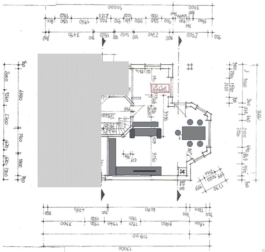 - Das Wandstück von Küche in Richtung Allraum mit 90 cm würde ich überprüfen ob es eine tragende Funktion hat oder ob es entfernt, bzw. reduziert werden kann.