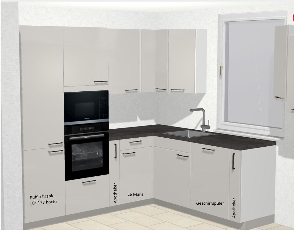 In den toten Ecken wurden uns jeweils Le Mans Schränke angeboten, so ist es auch auf dem 3D-Entwurf erkennbar. Nun wird im Forum von diesen Schränken abgeraten.
