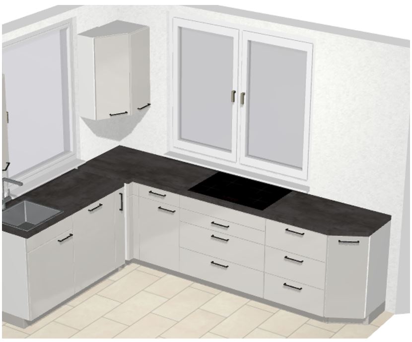 Leider war es falsch ausgedrückt – mit Apotheker-Eckschrank meinen wir einen Apotheker-Endschrank, ein ca 45 Grad abgeschrägter Eckschrank unter der Arbeitsplatte . Also den Schrank an der rechten Seite am Ende, der leicht abgeschrägt sein soll. So wie er auch auf der 3D-Zeichnung an der langen Fensterseite zu sehen ist.