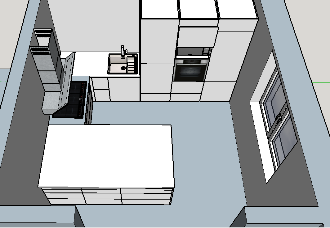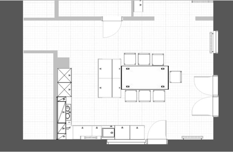 Ich habe noch ein bißchen gespielt um mehr Abstellfläche zu bekommen. So ganz glücklich bin ich nicht. Mit dem großen Vollautomaten und der großen Küchenmaschine sieht das ganze einfach nicht mehr schick aus. Und ob es so noch praktisch ist? Den Geschirrspüler würde ich an die kurze Seite unter die Küchenmaschine stellen, den Backofen links vom Kochfeld in der Insel, MUPL rechts davon, Töpfe unter dem Kochfeld. Vorräte und Toaster in die Hängeschränke. Backformen unter den Kühlschrank, Voratsdosen und Trinkflaschen zweite Schublade unter der Spüle, darüber Spüllappen. Essgeschirr auf die andere Inselseite. Hm, ich weiß nicht ...