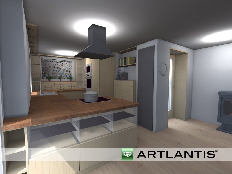 Dunstabzug im Ineslbereich würde nicht so eine Haube werden, sondern an der Decke mit integrierter Beleuchtung. (Lüfterbaustein schön verbaut)