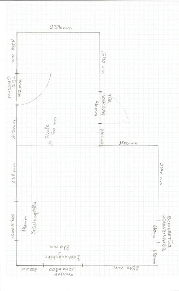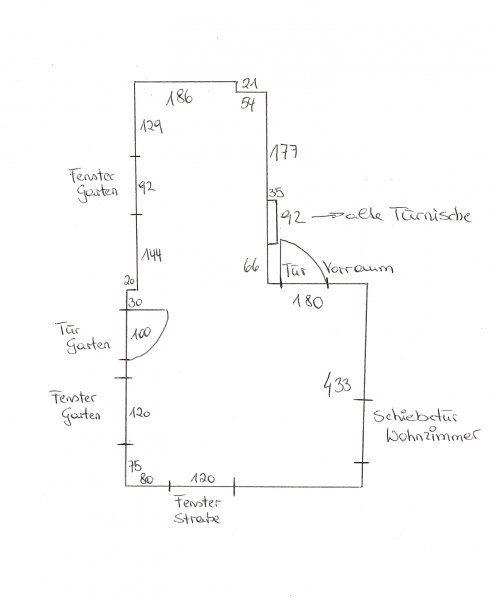 anbei der Raumplan, bei den Fenstern (Straße, Garten) ist ein jeweils ein Heizkörper, die Terassentür ist noch variabel, im schmalen Bereich wo Fenster Garten steht, ist jetzt im Moment eine Terassentür die wir gerne versetzten wollen. Wasser und Abfluß ist unter dieser Tür im Keller.