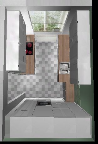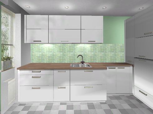 An der Wand links vom Fenster habe ich keine Hochschränke geplant, um viel Arbeits/Abstellfläche in Fensternähe zu haben.