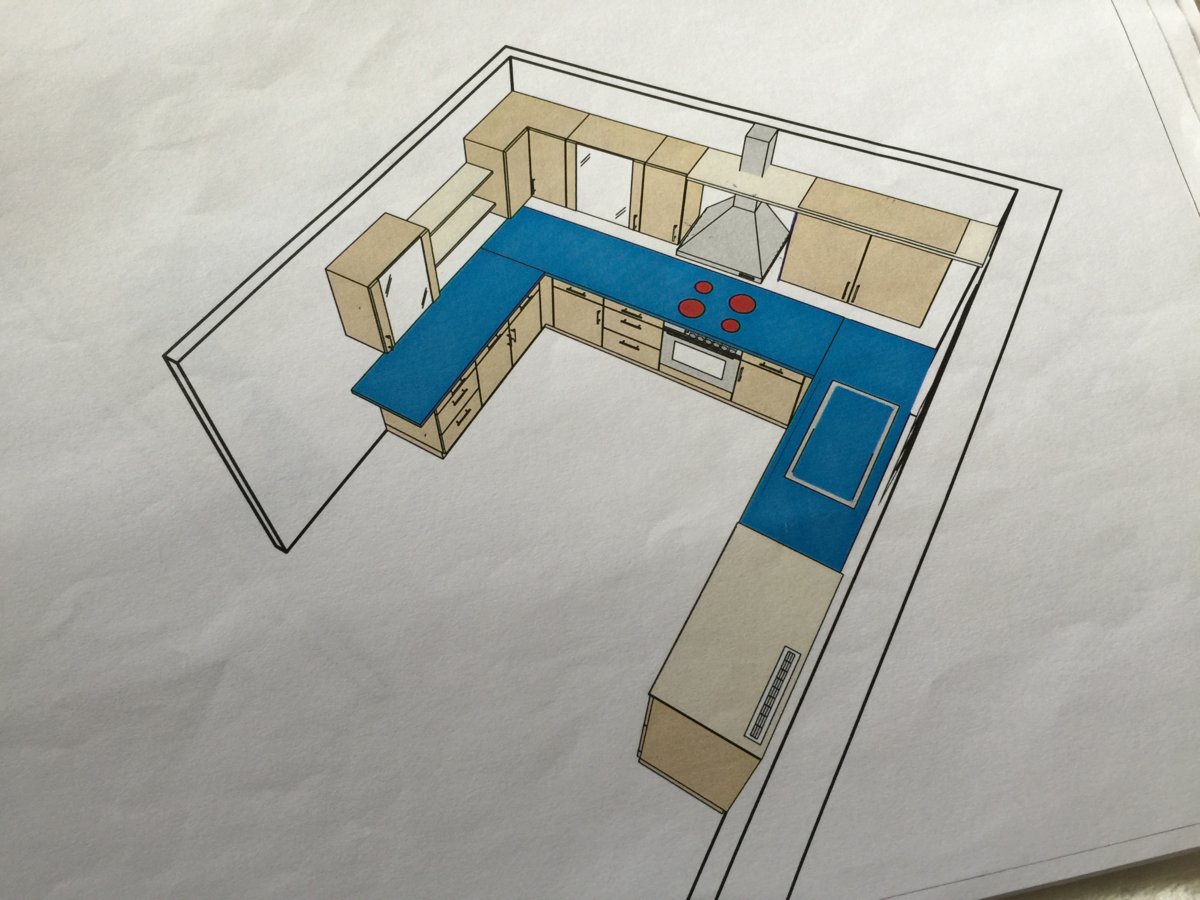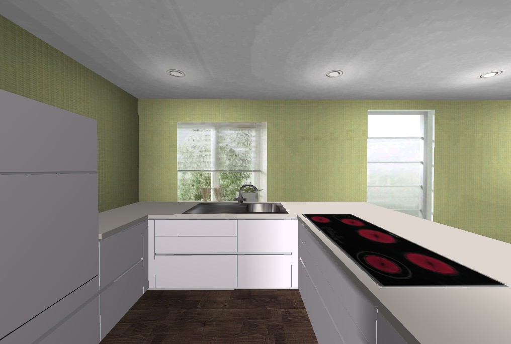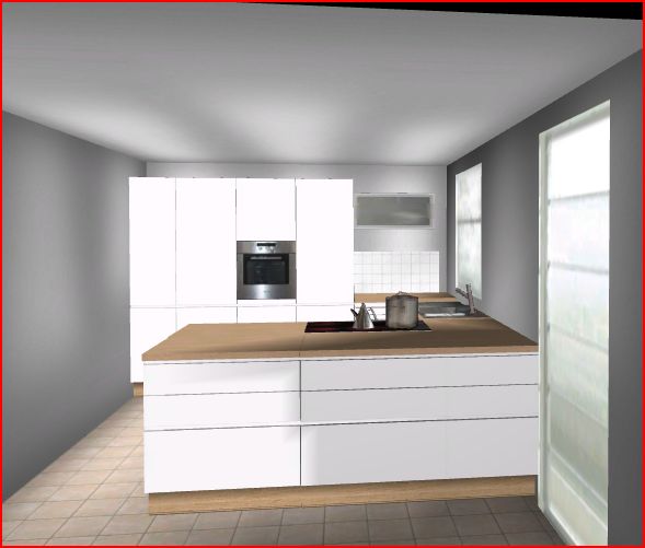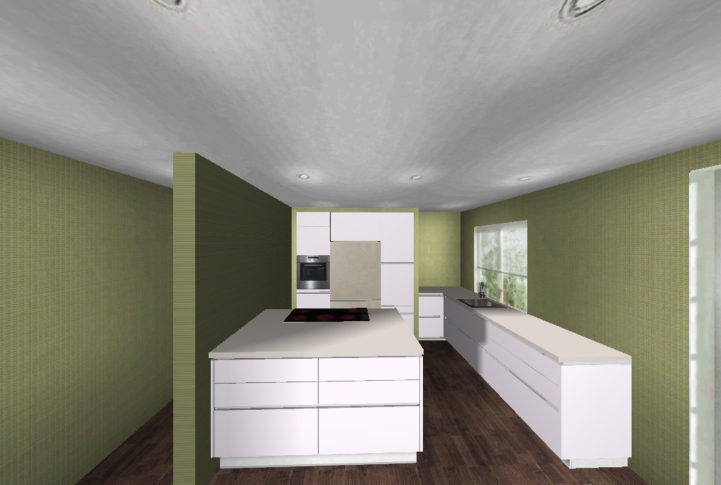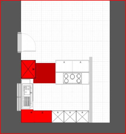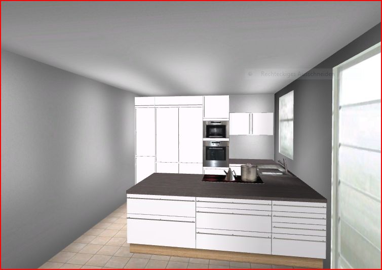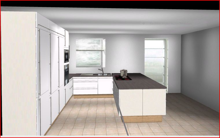 So richtig fit bin ich in dem Programm noch nicht, weiß nicht, wie man z.B. ein totes Eck einzeichnet, habe dafür einen Unterschrank eingebaut, damit ich dort kein Loch sondern Arbeitsplatte habe, also nicht wundern. Hab ich nur für die Darstellung so gebaut.