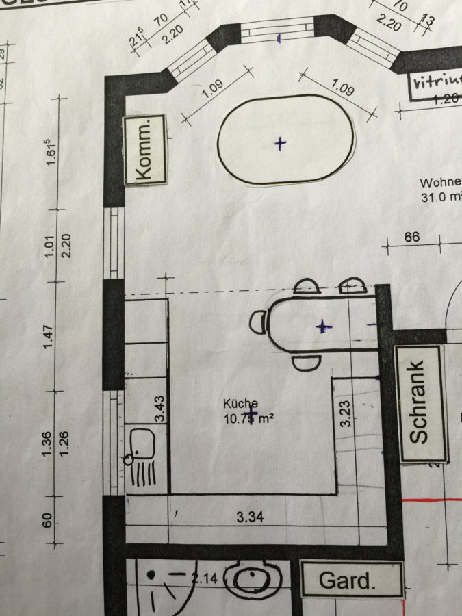 Die ersten beiden Bilder zeigen unseren Grundriss, Bilder 3, 4 und 5 die jetzige Küche.
