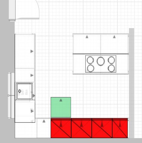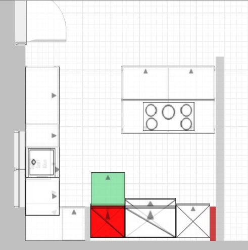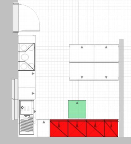Die grüne Fläche stellt die geöffnete GSP Tür dar. Lieber wäre mir, wenn die Spüle 20cm nach planoben rutschen könnte, dass man einen Tick mehr Beinfreiheit zwischen Spüle und GSP hat. Ausserdem hätte dann links der Spüle ein 60er US Platz, so aber nur ein 40er. Rechts der Spüle ist auch ein 40er, 3-3, mit MUPL oben.