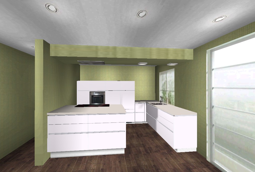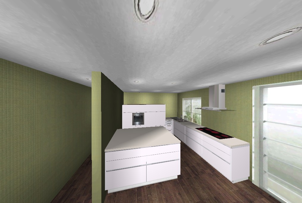 Ansonsten möchten wir gerne eine grifflose Küchenfront und eine Halbinsel, und dort wahrscheinlich das Kochfeld mit Dunstabzug darüber (bislang befindet sich das Kochfeld und Dunstabzugshaube an der Wand - Abluft)
