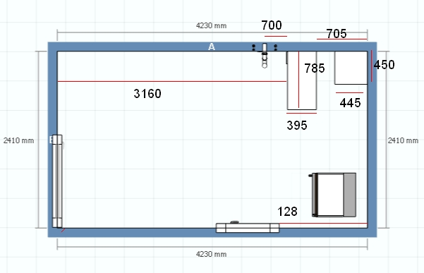 Den Kühlschrank in die Kammer zu integrieren, ist an sich eine gute Idee - aber dann ist das Kämmerchen so gut wie voll und sonst zu nicht mehr viel zu gebrauchen. Ließe sich die Kammer auch komplett der Küche zuschlagen, oder muss ein Teil der Trennwand stehenbleiben? Und was ist das für ein Vorsprung planoben rechts? Ist das ein Versorgungsschacht bzw irgendwas, das zugänglich bleiben muss (Zählerkasten etc)?