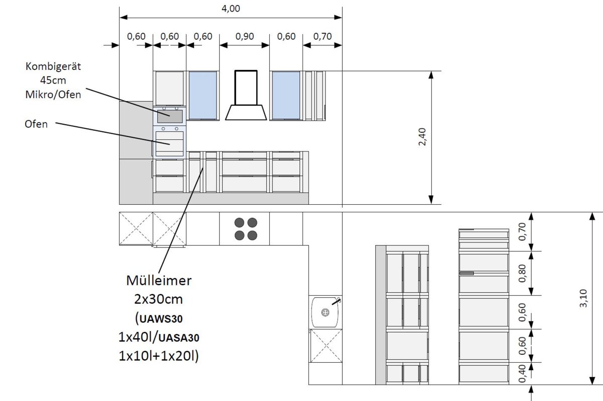 Den Müll würde ich nicht links vom Kochfeld planen, sondern unter der Hauptarbeitsfläche, zwischen Kochfeld und Spüle, das ist dort nömlich praktischer. Hier im Forum gibt es dafür sogar eine eigene Bezeichnung (nur im Forum gebräuchlich): * MUPL * (link für Beispiele anklicken).