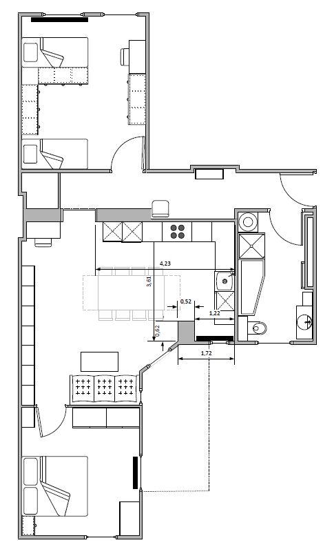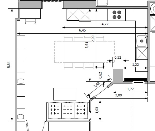 der schwarze Strich ist ein Heizkörper, na aktuellster Planung wird der aber verlegt und steht dann der Küche nicht mehr im Wege.