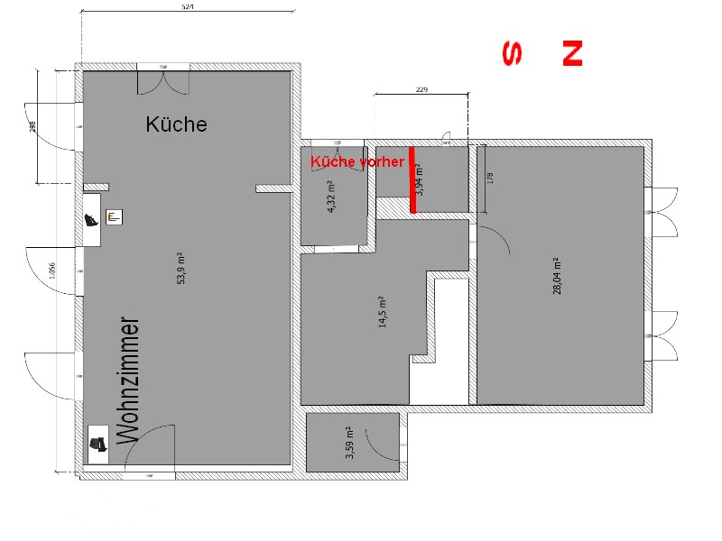 Wir haben uns gerade ein kleines "neues" Haus gekauft und planen jetzt wie wir es umbauen können, damit es zu uns passt. Leider hat das Haus nur eine winzige Küche 9qm, die auch noch recht dunkel ist. Deswegen haben wir uns überlegt, die Küche ins Wohnzimmer zu verlegen.