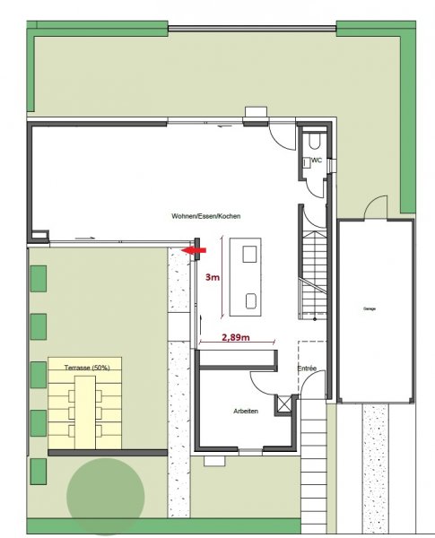 - Dunstabzug: Abluft. Zunächst wollten wir ein Bora System haben. Ganz überzeugt sind wir nicht davon, sodass wir uns zu einer Inselhaube entschlossen haben. Auch wegen der einfacheren Kanaldurchführung (der rote Pfeil auf dem Bild, könnte geändert werden, wenn die Spüle und das Kochfeld getauscht werden sollten) über die Decke durch die Wand als durch den Erdgeschossboden und Keller. Ohne die Haube würde es natürlich schöner aussehen.