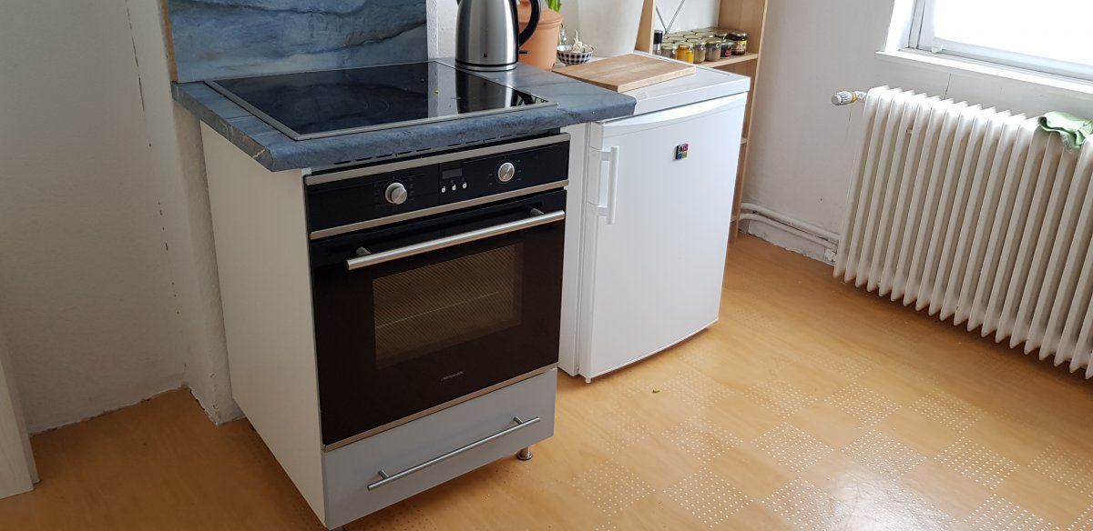 Der Starkstromanschluss kann auch noch verlegt werden bzw. es kann ein zweiter verlegt werden - der jetzige Herd/Backofen hat nur einen Starkstromanschluss und der Backofen läuft über einen normalen Stecker, aber er leistet nicht genug und muss auch ausgetauscht werden.