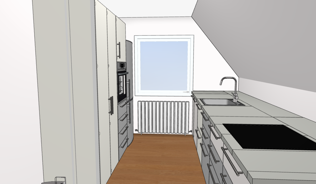 So ich habe das Plissee am Fenster vergessen, daher öffnet es von der Innenwand aus 98cm in den Raum mit etwas mehr als 45 Grad. Man könnte also noch an der Spüle stehen und es auflassen. Die neue Anordnung gefällt uns mehr.