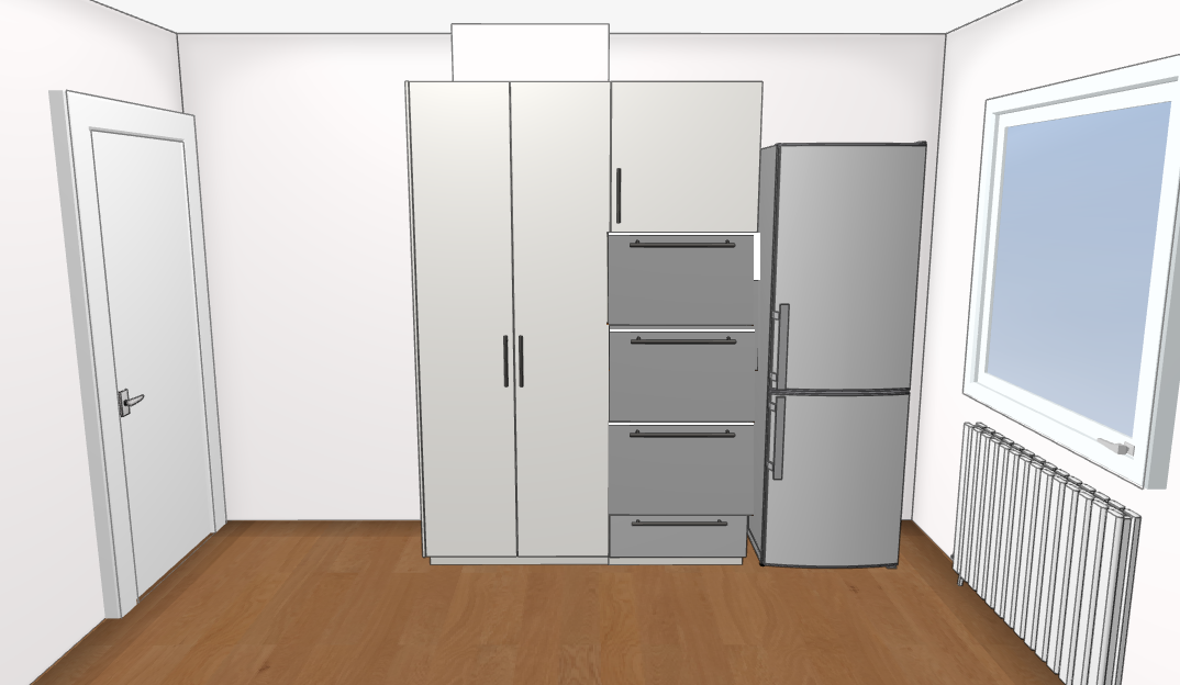 Vom Platz her könnte man rechts des Kühlschrankes vielleicht auch nachträglich noch ein schmales Regal einbauen. Manche stapeln dafür einfach auch Wandschrankkorpusse.