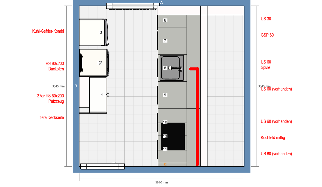 Kochfeld und Spüle haben die Plätze getauscht. Das Kochfeld liegt mittig über zwei Schränken, die dazu lediglich einen Ausschnitt im Korpus benötigen. Die beiden weißen Fronten unterm Kochfeld beherbergen neue niedrige MAXIMERA (unterm Kochfeld geht keine mittlere wegen des Hitzschutzbodens bzw. der beiden Hitzeschutzböden in diesem Vorschlag).