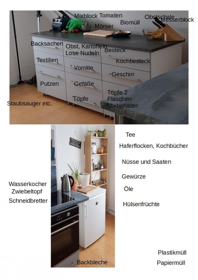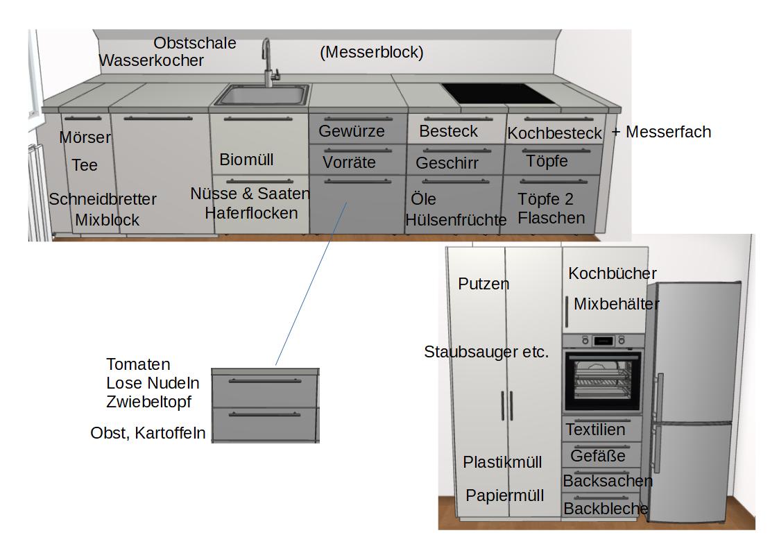 In den 4 niedrigen untereinander dann Besteck, Gewürze, Messer, Folien, Untersetzer etc. - die brauchen ja nicht so viel Platz. Darunter Plastikschüsseln, Siebe etc.