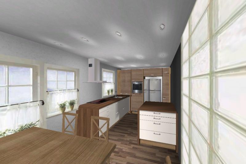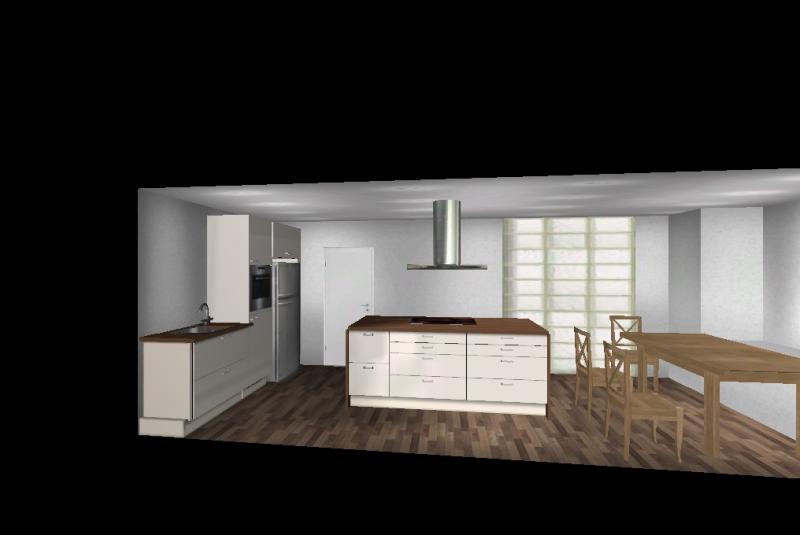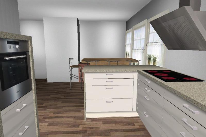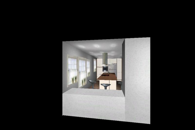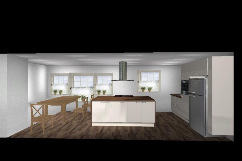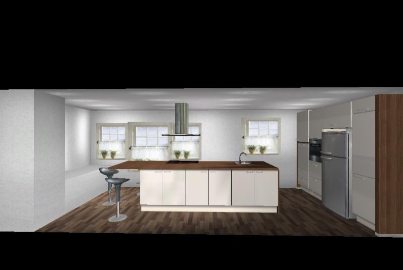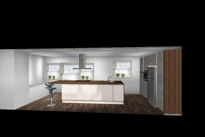 Hier einmal eine Variante wo die gewünschten Sitzplätze an der Insel sind, und das Platzproblem um die Spüle geklärt ist, ABER es bleibt immer noch das Problem bei einer Insel mit den Ganbreiten vor und hinter dieser. Und der Sitzplatz ist deutlich kleiner geworden. Ebenso müsste das Wasser für die püle in die Mitte des raumes verlegt werden (evtl über den Keller möglich, dann braucht es keinen neuen Boden) und einen Zusätzlichen Wasser/Abwasseranschluss an der Hochschrankwand. - Ich habe hier also das "Planänderungen möglich" mal wörtlich genommen.