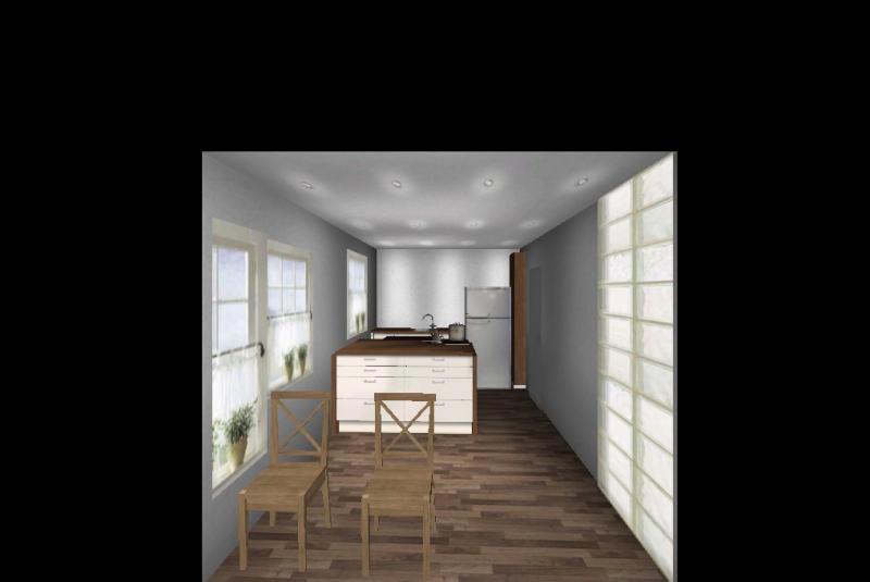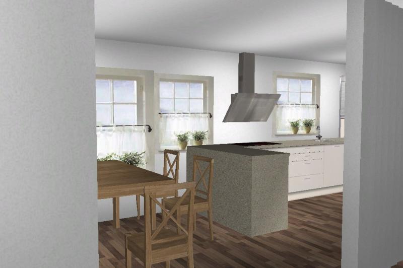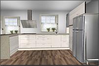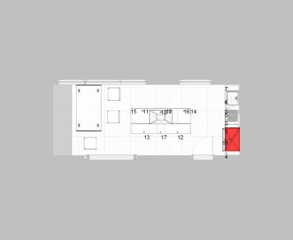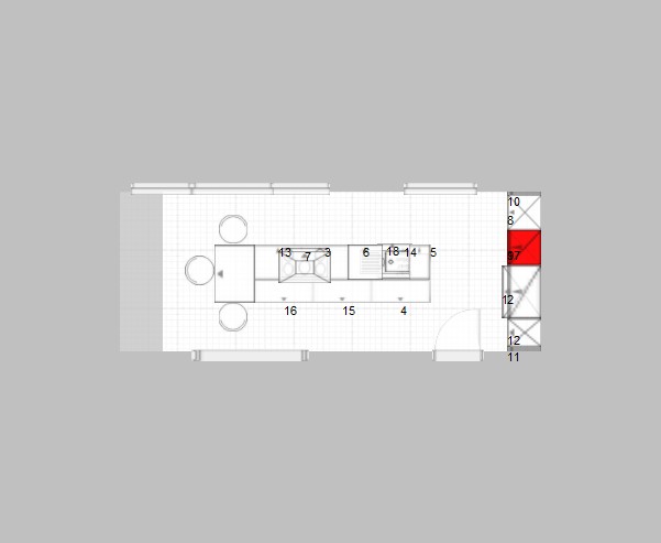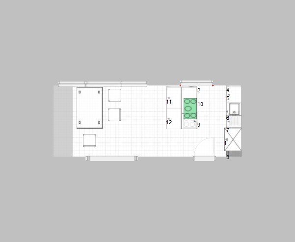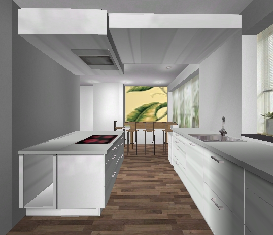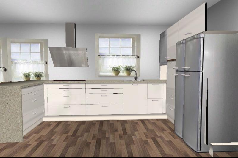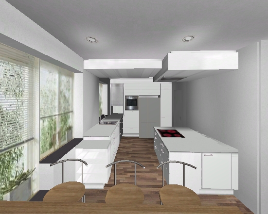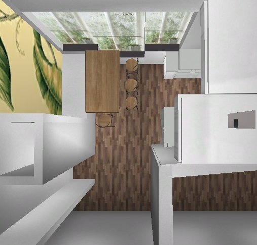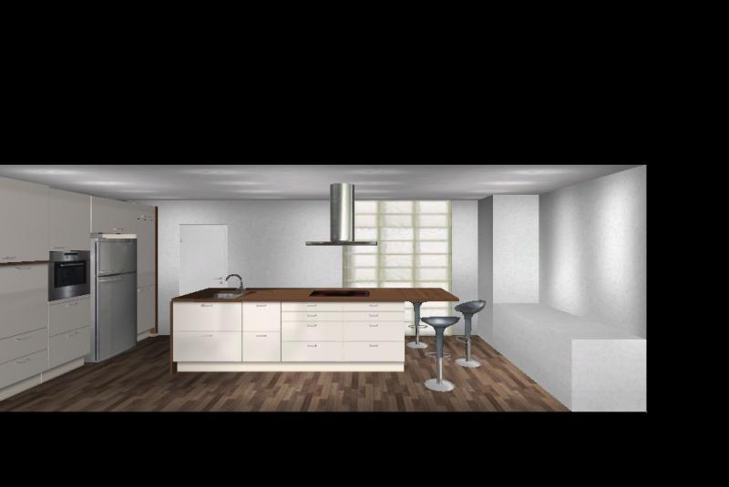 Hier einmal eine Variante wo die gewünschten Sitzplätze an der Insel sind, und das Platzproblem um die Spüle geklärt ist, ABER es bleibt immer noch das Problem bei einer Insel mit den Ganbreiten vor und hinter dieser. Und der Sitzplatz ist deutlich kleiner geworden. Ebenso müsste das Wasser für die püle in die Mitte des raumes verlegt werden (evtl über den Keller möglich, dann braucht es keinen neuen Boden) und einen Zusätzlichen Wasser/Abwasseranschluss an der Hochschrankwand. - Ich habe hier also das "Planänderungen möglich" mal wörtlich genommen.