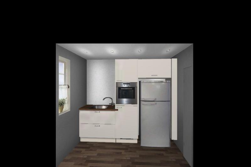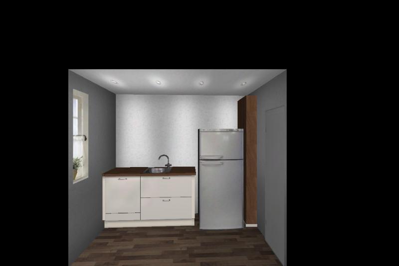 Die 2. Variante wäre eine 100 - 120er Schrank an der rechten Wand, aber nur 60-er oder auch 80-er breite, keine "Insel". Evtl. paar Regale drüber.