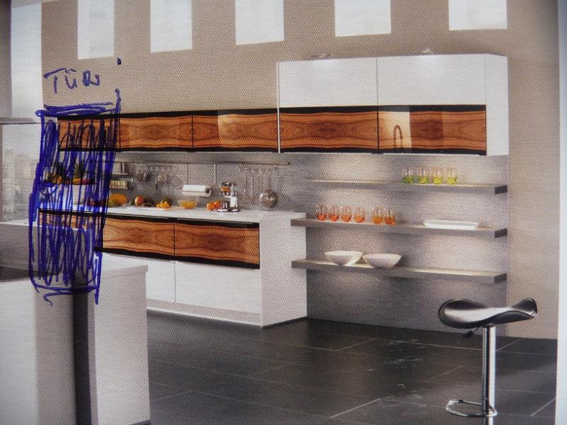 soll auf der rechten Seite eine ca. 100-120cm breite Schrank mit rumherum Regale stehen (kein Servierwagen und ohne Halbinsel wegen Durchgang)