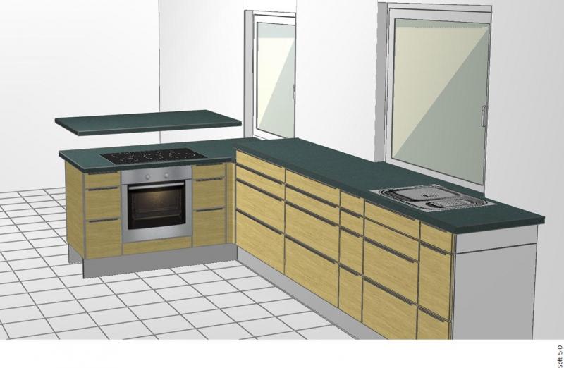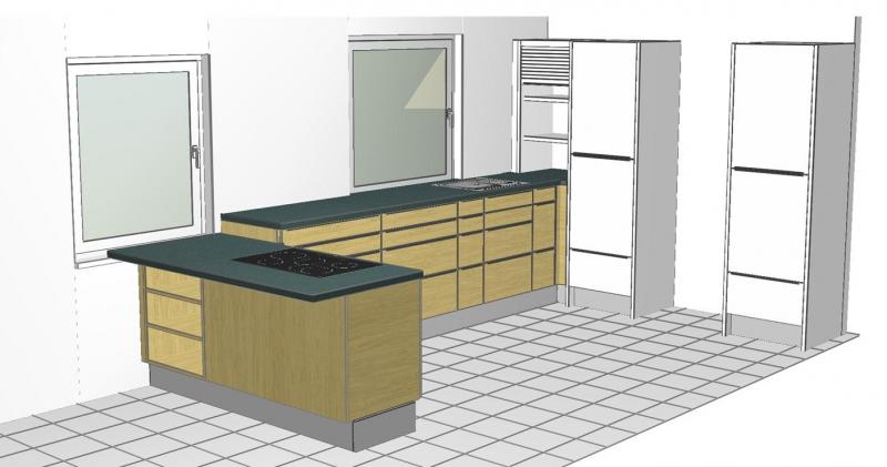 Trotz Euren Mahnungen und Warnungen haben wir uns doch für eine Koch/Halbinsel entschieden. U.a. gefällt es uns besser wenn der Kühlschrank hinten ist und der Weg zwischen den Türen frei bleibt.