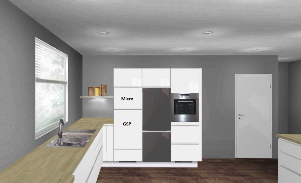Unser Standard Kühlgerät kommt separat an die Wand, an der auch die Speisekammer ist.
