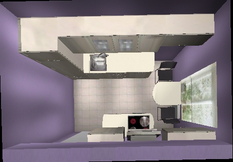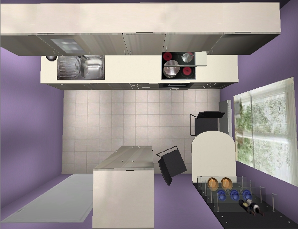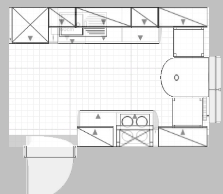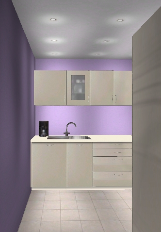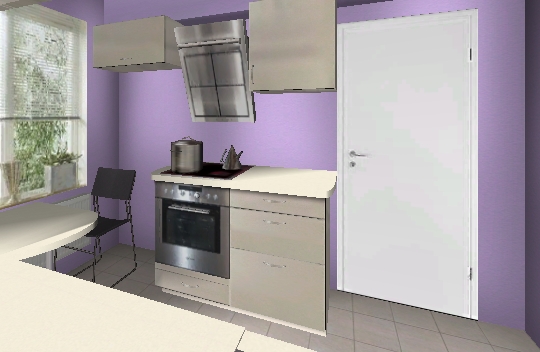 Andere Möglichkeit autarkes Kochfeld, Backofen da, wo er in meiner Variante 1 ist und Kochfeld etwas mehr Richtung Tür, aber nicht symmetrisch, ich halte es für sinnvoll rechts (aus Bedienersicht) vom Kochfeld etwas mehr Platz zu haben als links.