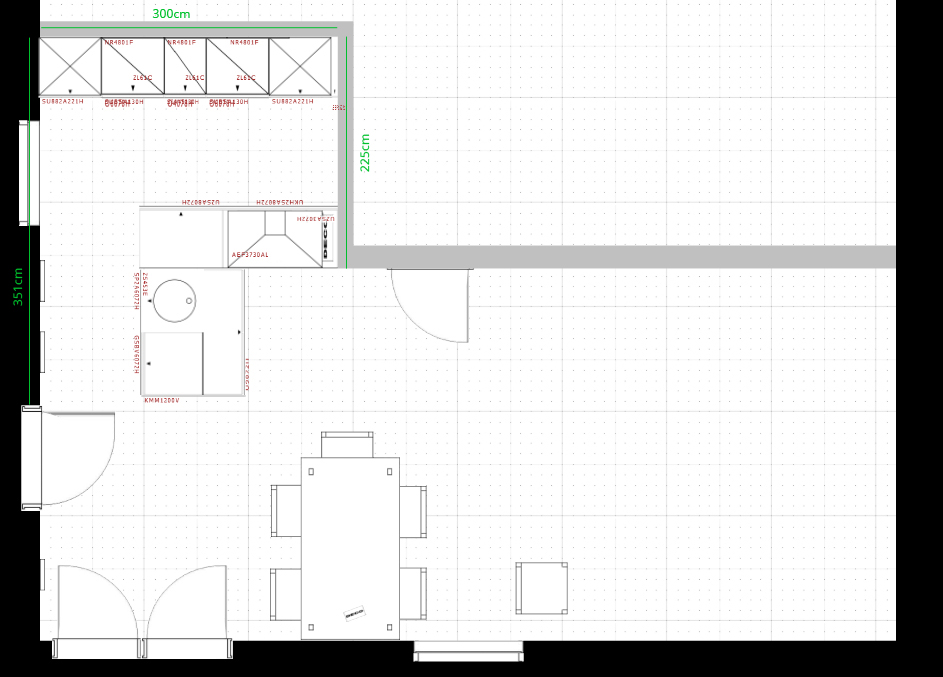 Größe Kochfeld (60 oder doch 80?), Spülbecken+evtl. Abtropffläche, Dunstabzug oberhalb des Kochfeldes oder Muldenabzug? Die konkreten Schränke (ob jetzt Auszug oder Tür usw.) habe ich noch nicht im Detail durchgeplant, ich bin noch immer am überlegen ob ich mit diesem Entwurf schon die bestmögliche Raumaufteilung gefunden habe.