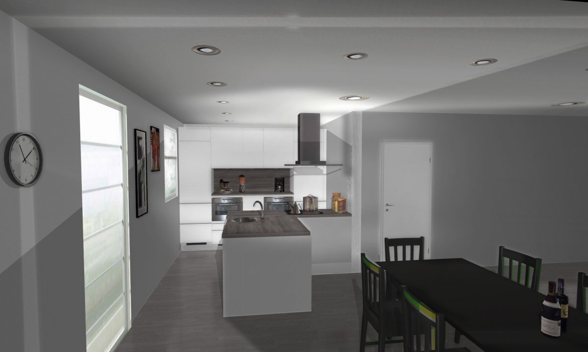 Ja also ich muss gestehen ich finde die Form auch selbst noch gewöhnungsbedürftig ;-) Aber mir ist keine andere Variante eingefallen bei der wir die beiden großen Kühlgeräte unterbringen können, Spüle und/oder Kochfeld zum Raum hin ausrichten und trotzdem noch genug Platz zum bewegen haben.