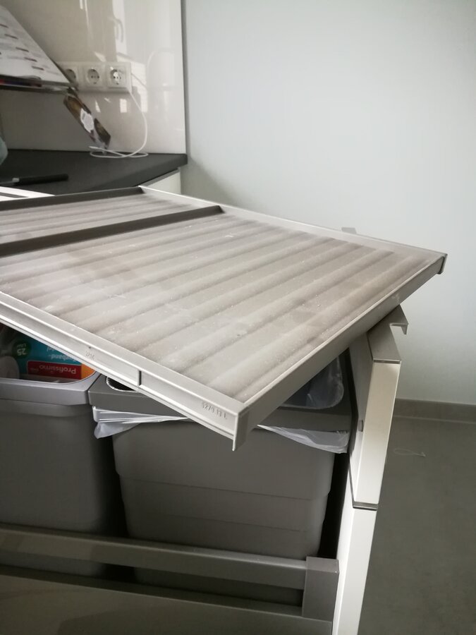 Die Artikelnummer von Ninka für die dunkelgrauen 12 L Eimer lautet wie folgt 5170.92 41514. Dazu gibt es zwar passende Deckel, mein Problem dabei ist nur, dass ich den Deckel ja irgendwo ablegen müsste, weil es kein Klappdeckel ist. Das sind jedes Mal 2 Griffe mehr. Da wir morgens zum Beispiel 5 Esspresso trinken, muss 5 mal der Kaffeesatz entleert werden, jedes Mal dafür den Deckel irgendwo abzulegen, ist für mich nicht Komfortable. Beim nächsten Montagetermin wollte uns der Monteur daher einen Zwischenboden aus Korpusmaterial knapp über dem Eimerrand einziehen. Ob das eine gute Lösung ist, werde ich wohl erst nach ein Paar Monaten sagen können, wenn der Sommer und die heißen Tage überstanden sind. Aber wenn alle Stricke reisen entferne ich den Zwischenboden wieder und mache einen Deckel rein. Diese Option ist immer offen. Leider habe ich auch hier im Forum noch keine andere Lösung für Ninka Eimer gesehen bis auf den Eimer offen zu lassen oder eben den Deckel drauf zu tun. Wenn Ninka Klappdeckel wie IKEA hätte, wäre alles kein Problem. Aber IKEA hat eben nicht diese 12 L Größe für einen 2rastrigen Auszug. Es ist halt immer irgendwas. Entweder hat man das eine oder das andere :-)