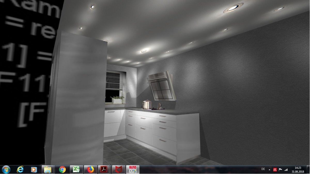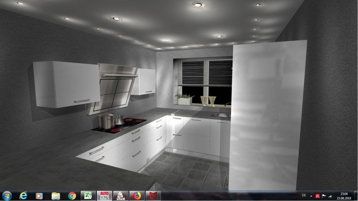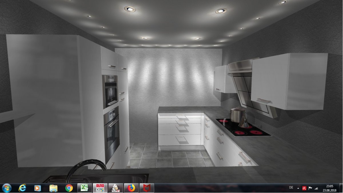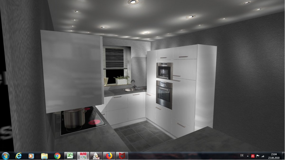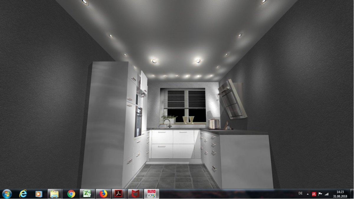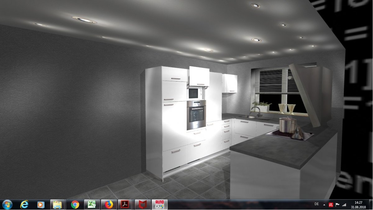 2) Die Fensterseite planoben bereitet uns Kopfzerbrechen, wir finden hier noch keine optimale Lösung. Die Küchenstudios empfehlen von planoben links nach rechts immer