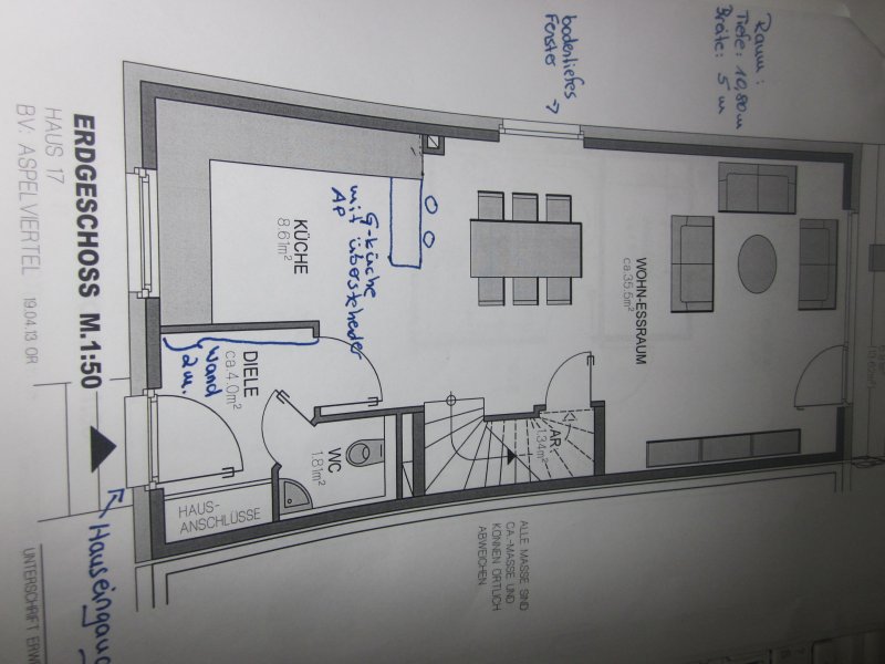 Wir haben ein kleines Haus gekauft. Da die Etagen von der Quadratmeterzahl relativ klein sind, erfordert es bei uns sorgältiger Planung. Der hier relevante Bereich ist das Erdgeschoss. Es handelt sich, wie im Thementitel angeschnitten, um einen offenen Koch-/Ess-/Wohnbereich (Bild vom Grundriss des EG´s als Anhang, alle Anschlüsse sind noch variabel).